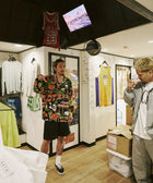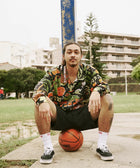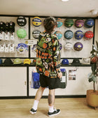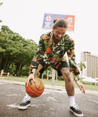 沖縄の「文化・自然・心」をEanbeらしく表現するシリーズ「RYUKYU COLLECTION」より、「バスケ」をテーマにした総柄のロングスリーブアロハシャツ。アートワークはイラストレーターの髙城 琢郎氏が担当。